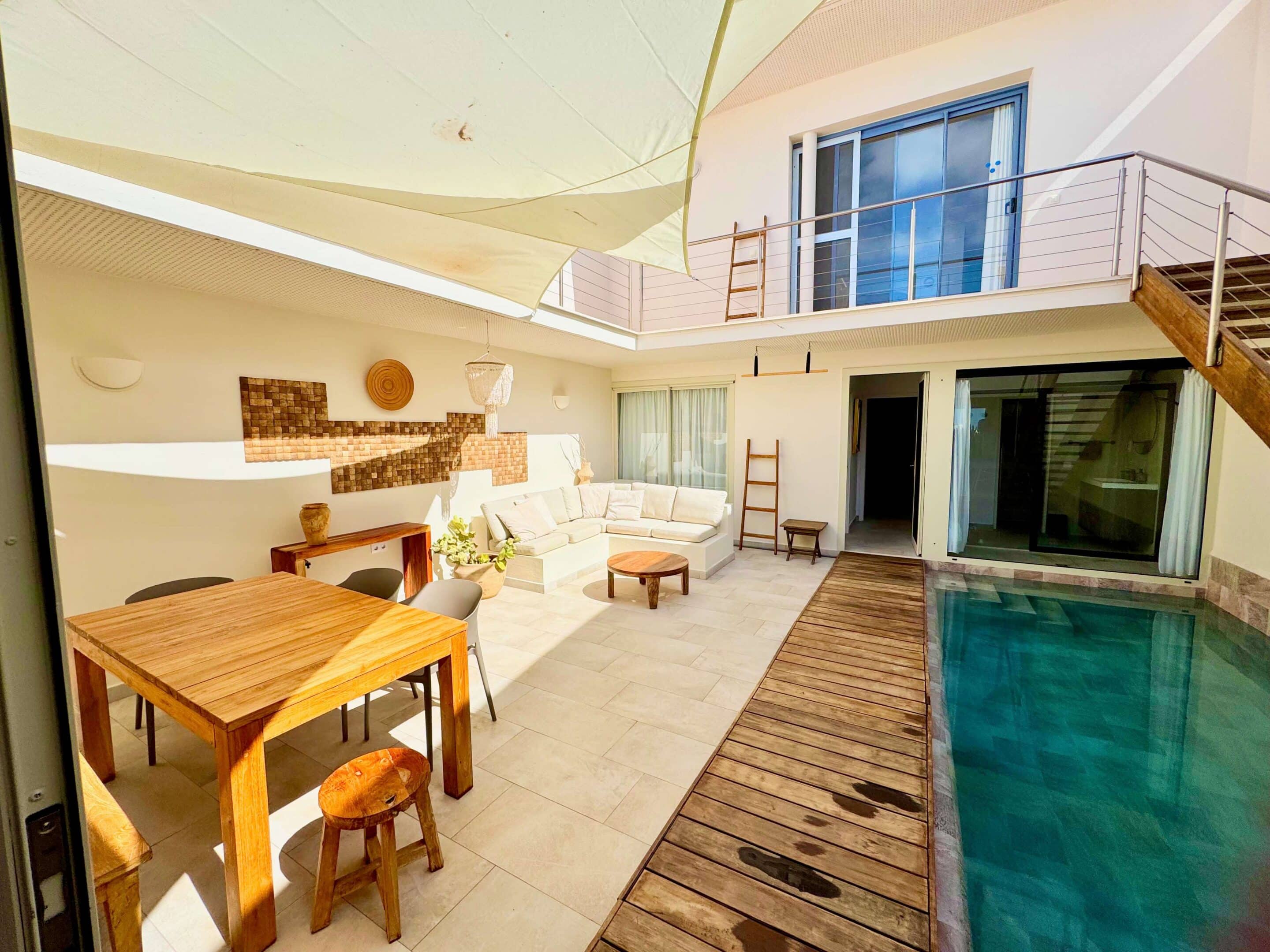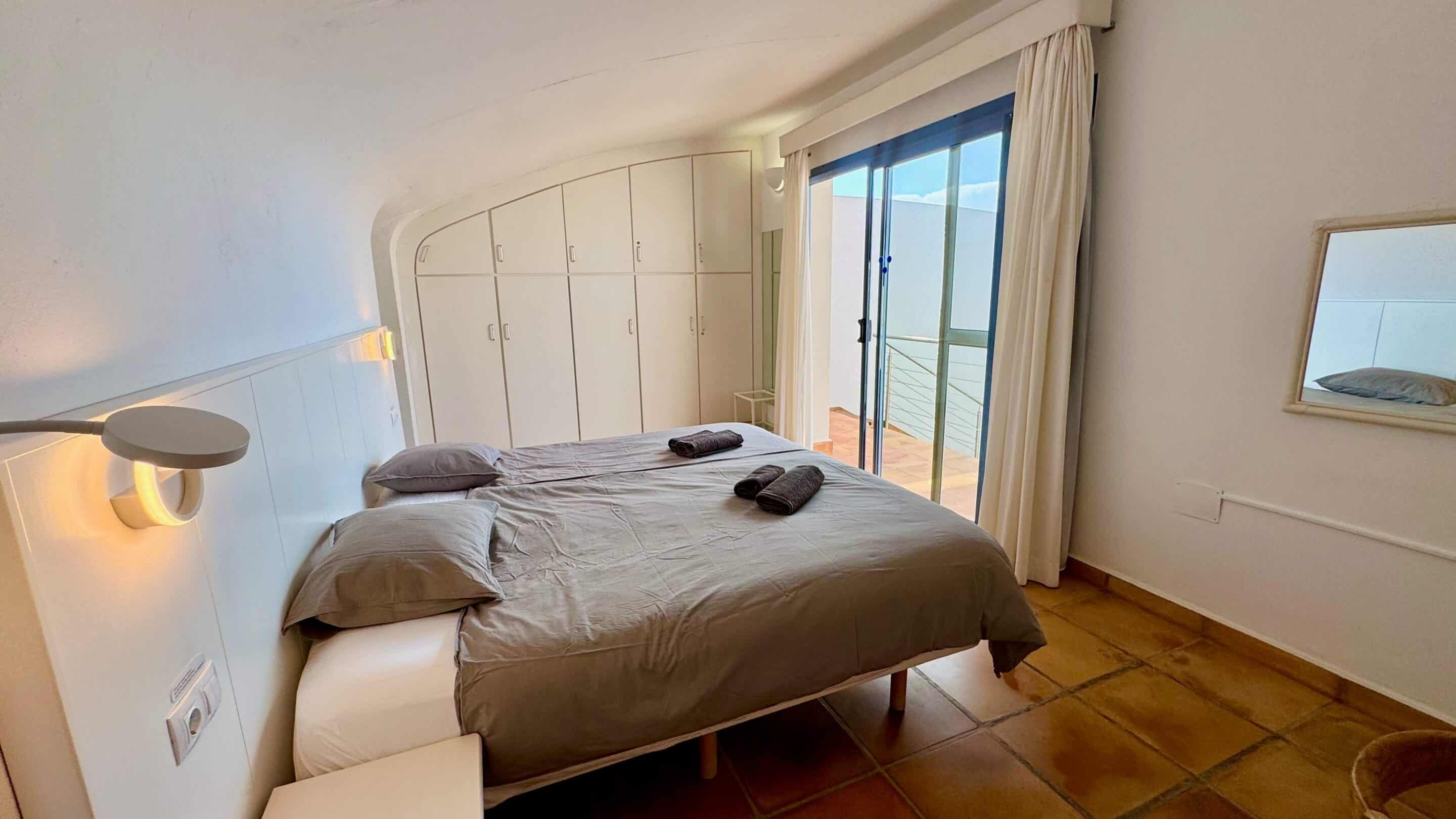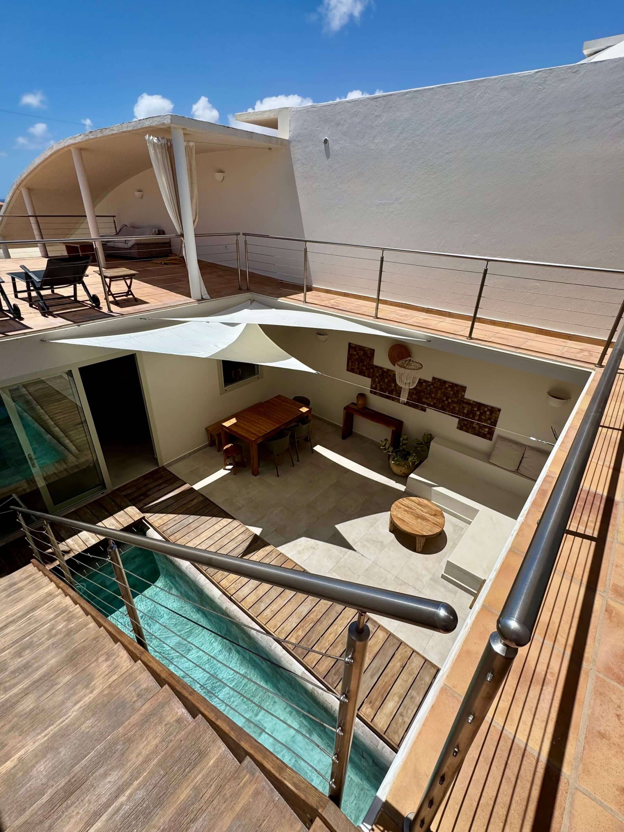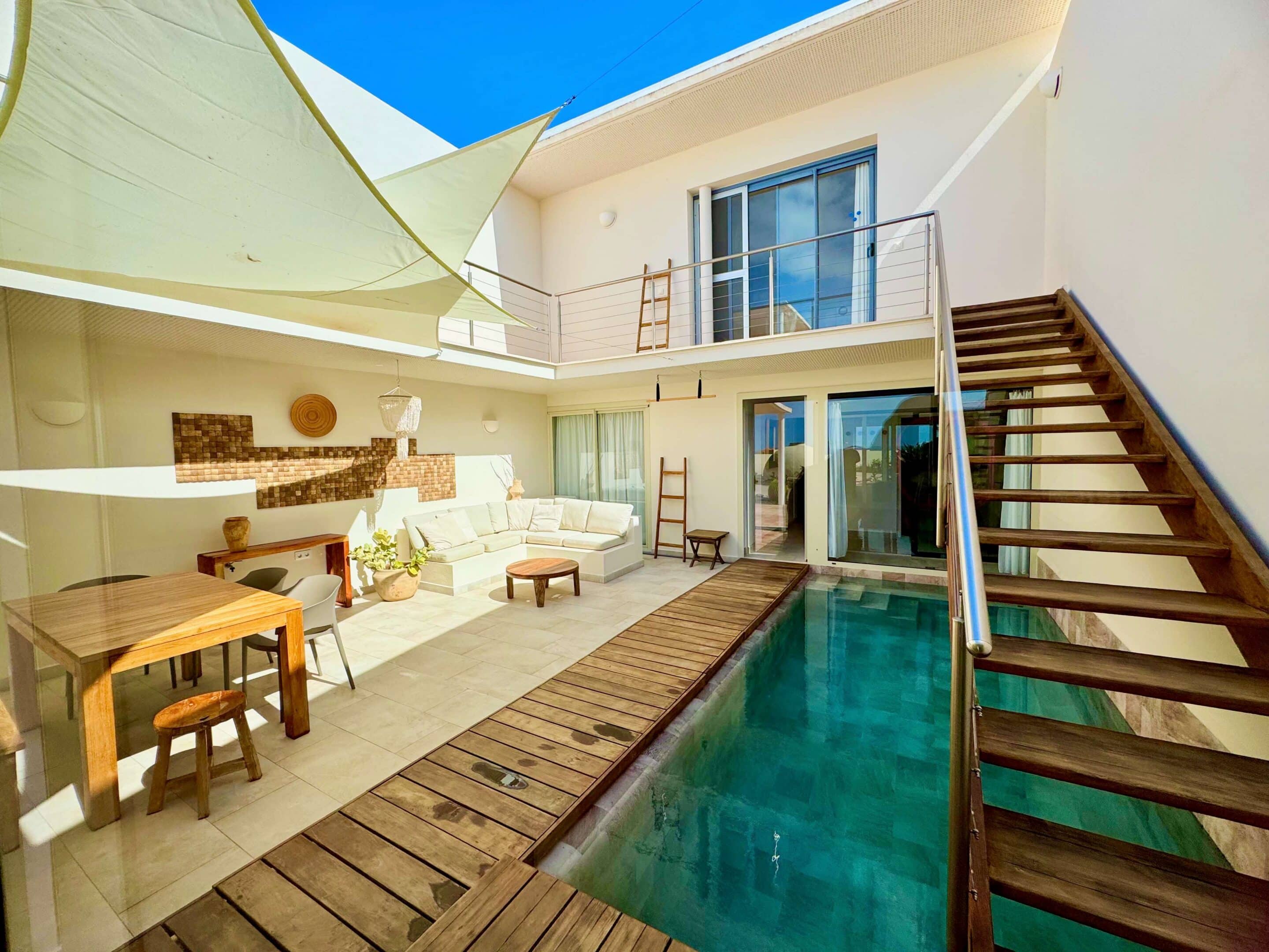 Der blickgeschützte große Innenhof mit Privatpool ist mit einen Sitzecke ausgestattet. Durch den Patio erreicht man das Schlafzimmer mit ein Einzelbett. Das geräumige Badezimmer umfasst Dusche, WC und Bidet. Im Innenhof führt eine Treppe zum oberen Schlafzimmer (1 Doppelbett 200 x 200 ) mit großem Badezimmer (Dusche, Badewanne und WC / Bidet jeweils separat). Ebenfalls erreichen Sie die teilüberdachte Sonnenterrasse der (Villa) Casa Ubu mit phantastischem Meerblick auf die Bucht der Costa Calma. Hier kann man gemütlich essen und entspannt in den Tag einsteigen bzw. die Erlebnisse des Tages Revue passieren lassen.