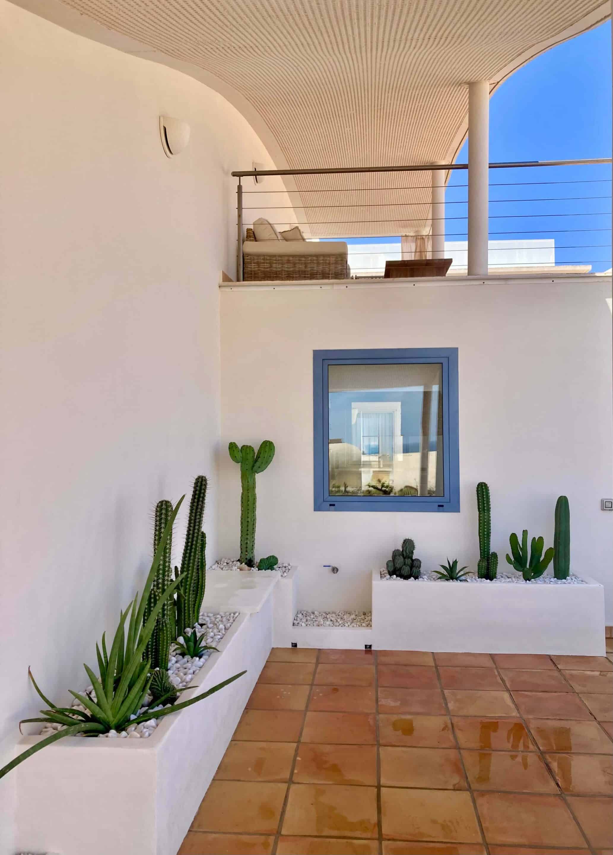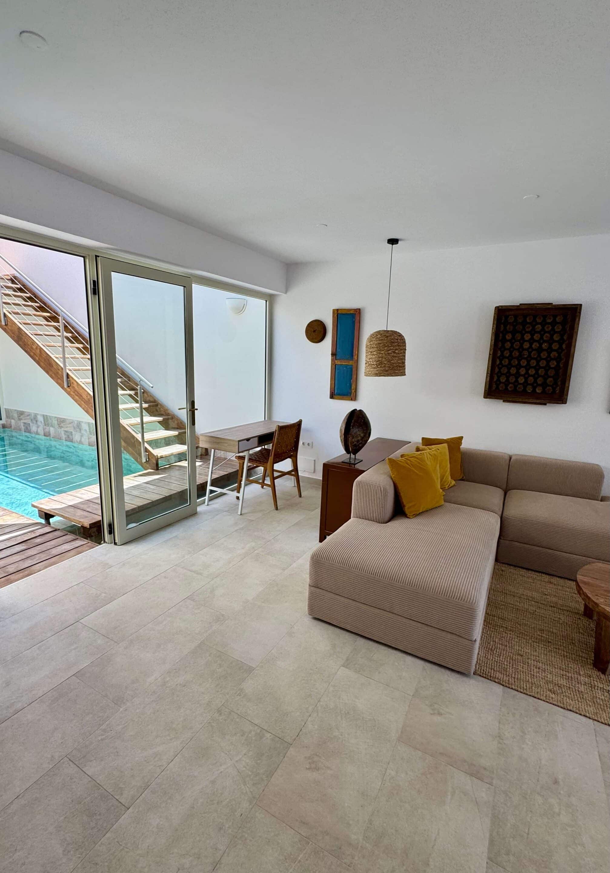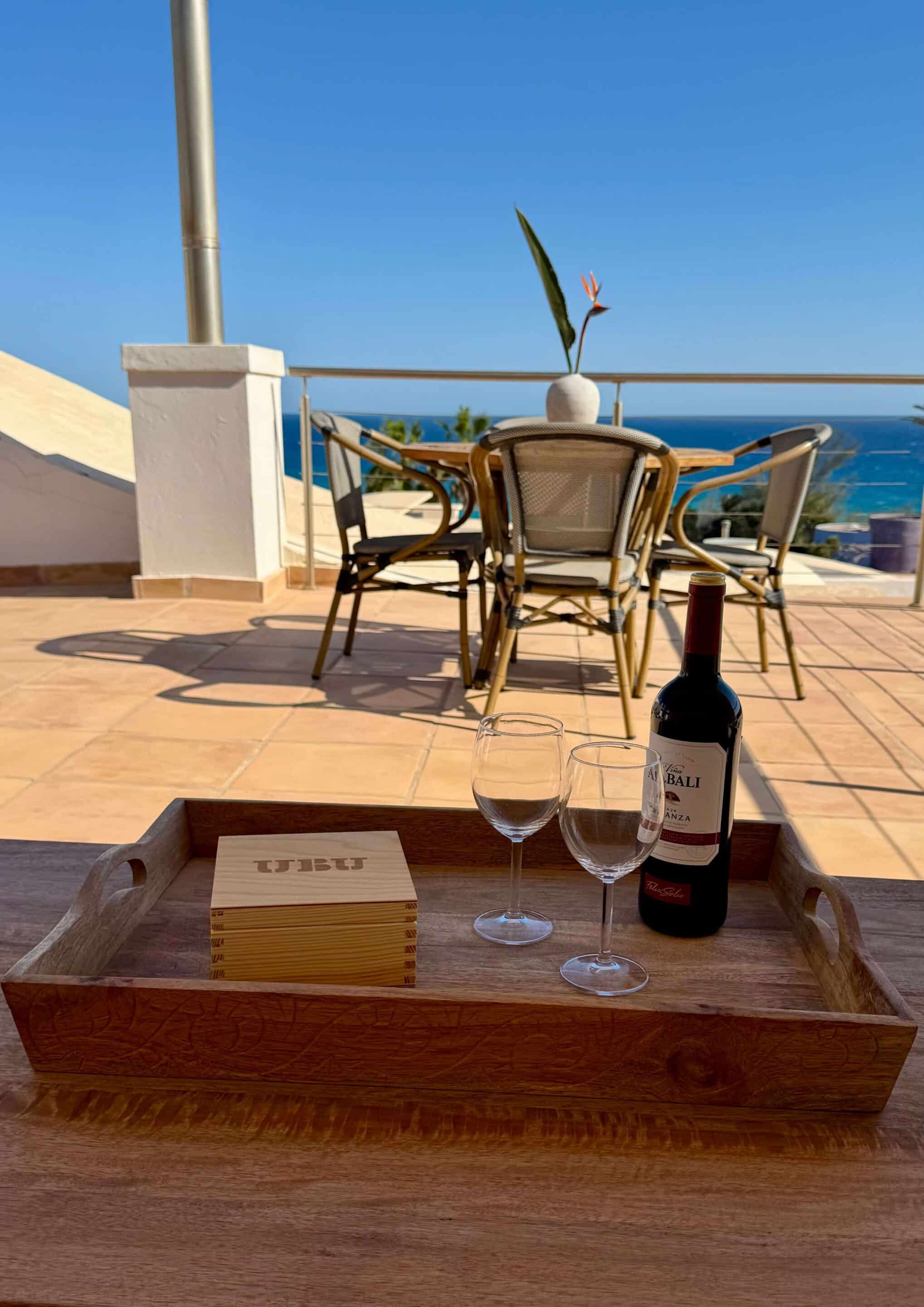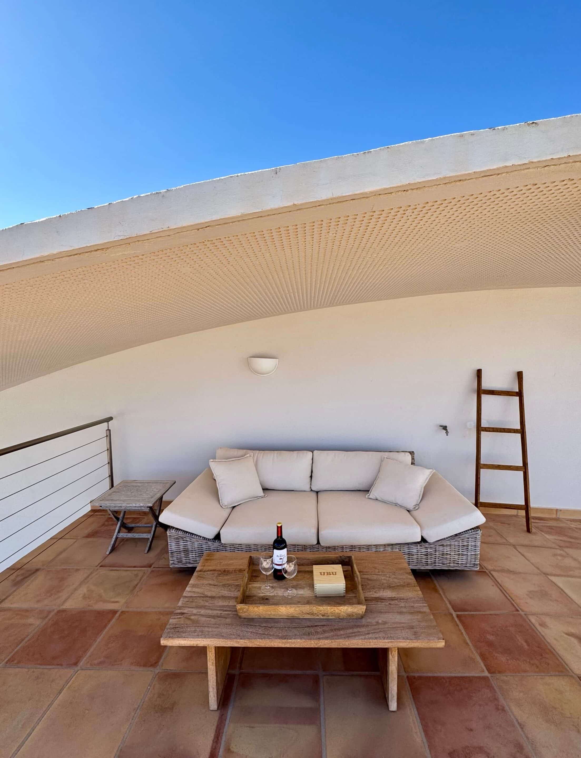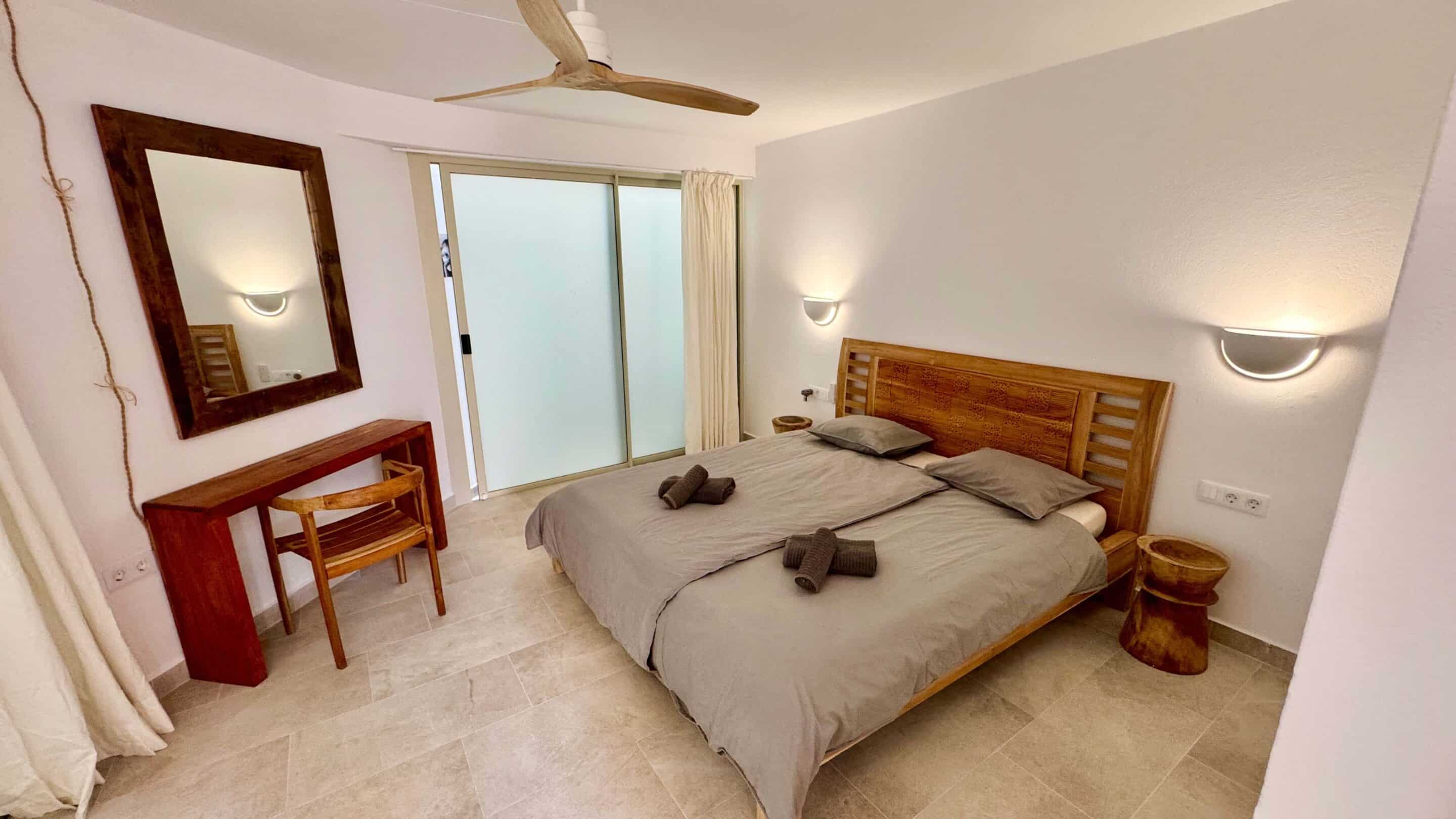 Der blickgeschützte große Innenhof mit Privatpool ist mit einen Sitzecke ausgestattet. Durch den Patio erreicht man das Schlafzimmer mit ein Einzelbett. Das geräumige Badezimmer umfasst Dusche, WC und Bidet. Im Innenhof führt eine Treppe zum oberen Schlafzimmer (1 Doppelbett 200 x 200 ) mit großem Badezimmer (Dusche, Badewanne und WC / Bidet jeweils separat). Ebenfalls erreichen Sie die teilüberdachte Sonnenterrasse der (Villa) Casa Ubu mit phantastischem Meerblick auf die Bucht der Costa Calma. Hier kann man gemütlich essen und entspannt in den Tag einsteigen bzw. die Erlebnisse des Tages Revue passieren lassen.