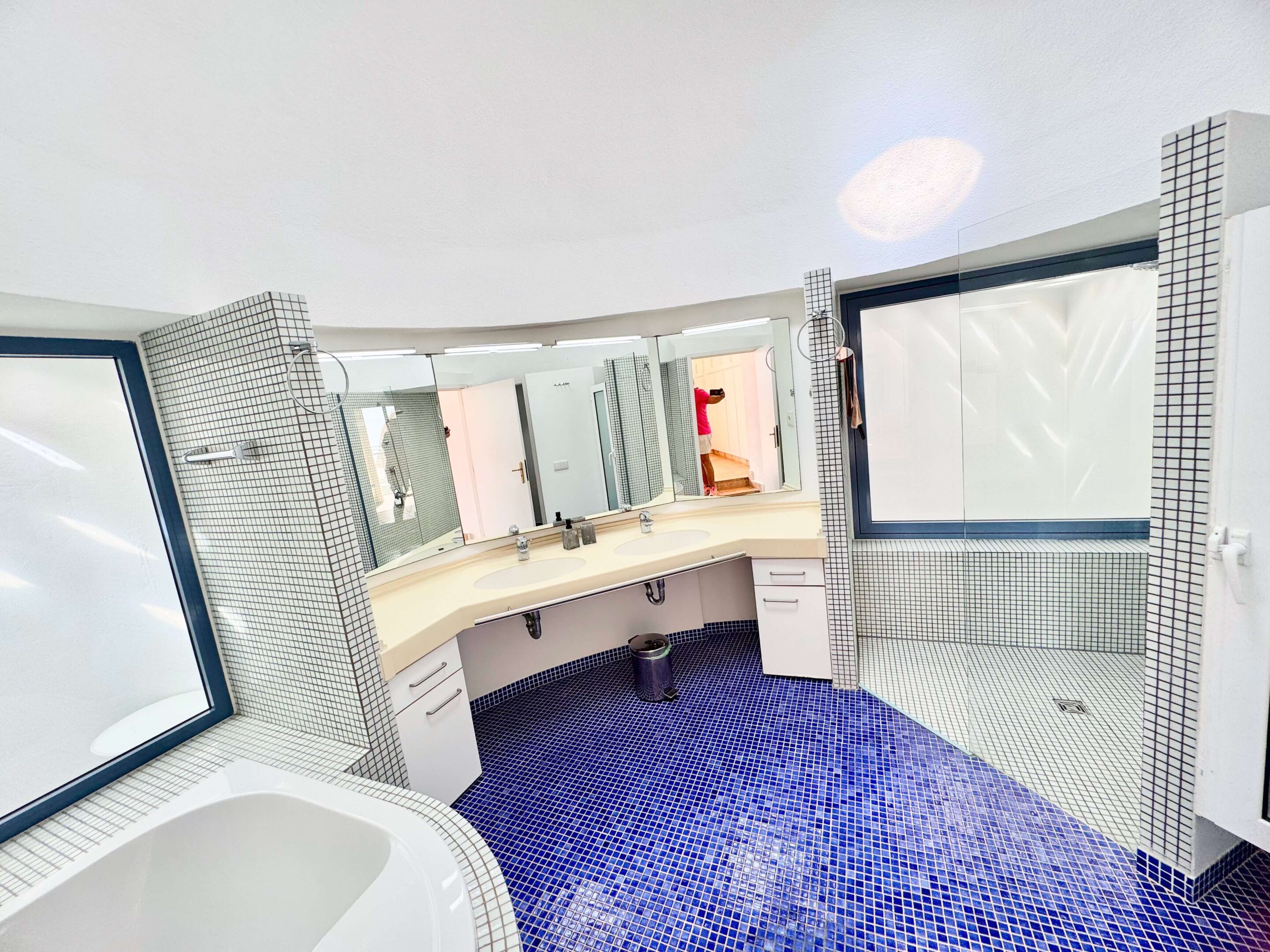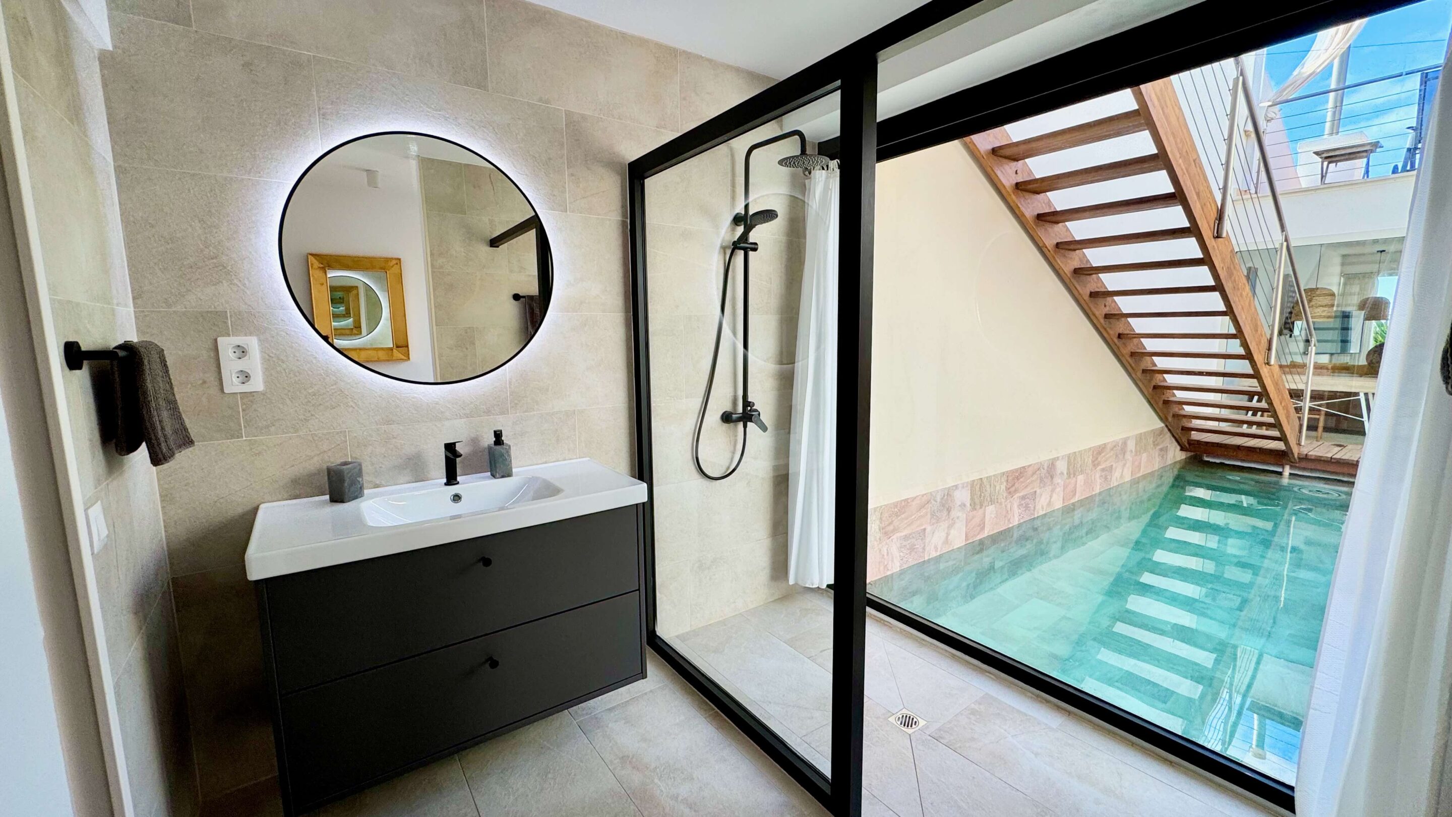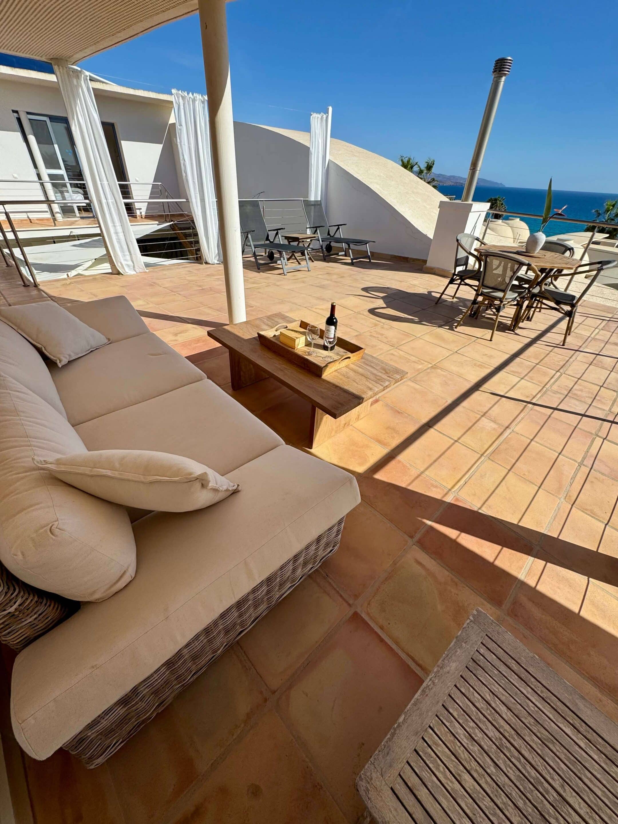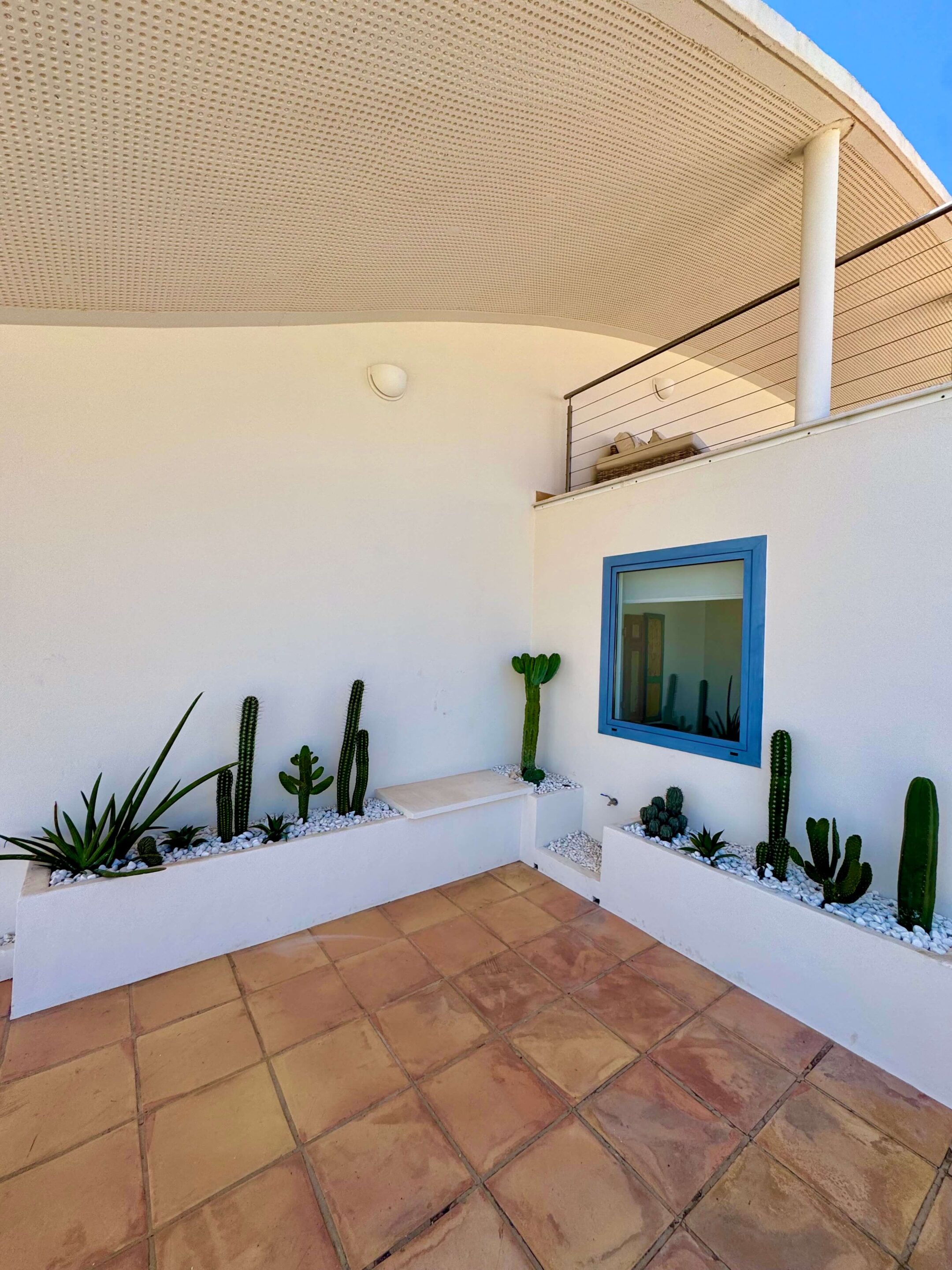 Der blickgeschützte große Innenhof mit Privatpool ist mit einen Sitzecke ausgestattet. Durch den Patio erreicht man das Schlafzimmer mit ein Einzelbett. Das geräumige Badezimmer umfasst Dusche, WC und Bidet. Im Innenhof führt eine Treppe zum oberen Schlafzimmer (1 Doppelbett 200 x 200 ) mit großem Badezimmer (Dusche, Badewanne und WC / Bidet jeweils separat). Ebenfalls erreichen Sie die teilüberdachte Sonnenterrasse der (Villa) Casa Ubu mit phantastischem Meerblick auf die Bucht der Costa Calma. Hier kann man gemütlich essen und entspannt in den Tag einsteigen bzw. die Erlebnisse des Tages Revue passieren lassen.